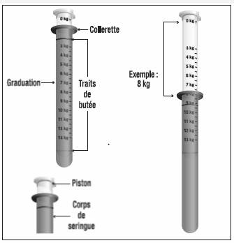 Par exemple : pour prélever la dose à administrer pour un enfant de 8 kg, tirer le piston jusqu’à ce que la graduation 8 kg inscrite sur le piston atteigne la collerette de la seringue.
