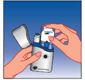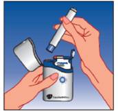 · Enfoncer l'injecteur automatique dans la recharge, puis tourner dans le sens des aiguilles d'une montre jusqu'à blocage Note: Ne pas appuyer sur le bouton bleu du déclencheur |