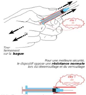 Tenir d'une main la seringue par le manchon et tirer fermement de l'autre sur la bague pour déverrouiller le manchon et l'amener jusqu'au clic de verrouillage (schéma).