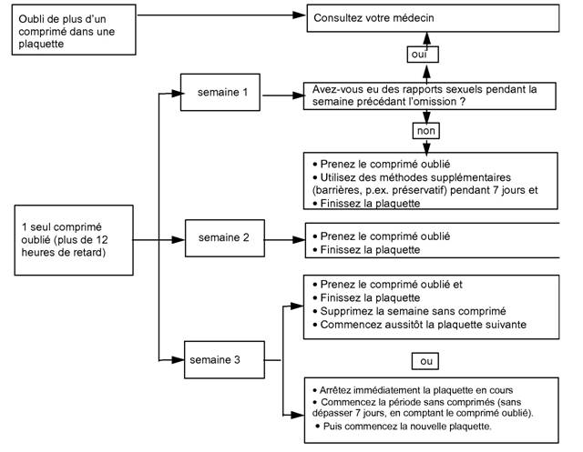 1. Prenez le comprimé oublié dès que vous constatez l'oubli, même si cela implique la prise de deux comprimés en même temps. Continuez à prendre les comprimés suivants à l'heure habituelle. Au lieu de respecter la période d'arrêt de 7 jours, commencez la plaquette suivante.