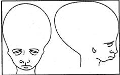 Schéma des malformations externes possibles suite à une grossesse survenue lors d’un traitement à l’isotrétinoïne : Oreille(s) absente(s) ou d’insertion basse, grosse tête et petit menton, anomalies oculaires, malformations du palais. Des malformations internes sont souvent associées. Ces malformations touchent le cœur, le thymus, le système nerveux et la glande parathyroïde.