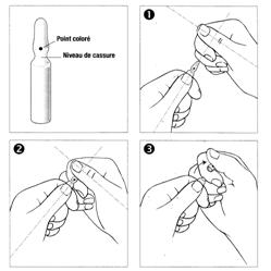 Une ampoule bouteille de type OPC (One Point Cut) est caractérisée par une zone de fragilité au niveau du col de l'ampoule, repérée par un point coloré. Pour ouvrir correctement l'ampoule, il est indispensable d'exercer une pression au niveau de cette zone selon la procédure suivante :