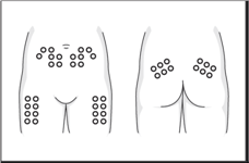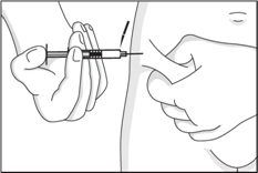 6. Injecter lentement la dose nécessaire dans le tissu graisseux par exemple dans la ceinture abdominale, la face antéro-externe de la cuisse, le bas du dos ou la partie supérieure du bras. Attendre quelques secondes avant de retirer l’aiguille et de lâcher le pli de la peau pour donner le temps à la solution de diffuser. |