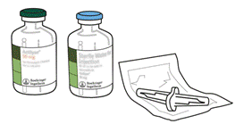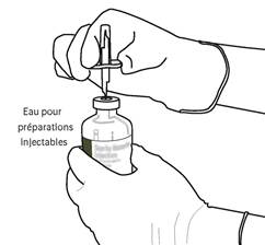 (*si une canule de transfert est inclut dans la boîte. La reconstitution peut aussi être faite avec une seringue et une aiguille.)