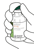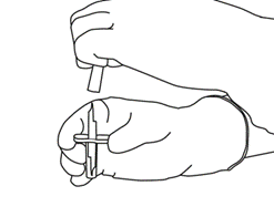 Tenez fermement le flacon contenant l’eau pour préparations injectables et la canule de transfert avec une seule main, à l’aide des deux rabats de chaque côté de la canule. Prenez le flacon d’ACTILYSE contenant la poudre et tenez-le au-dessus de la canule de transfert en positionnant l’extrémité pointue de la canule de transfert bien au centre du bouchon.