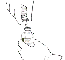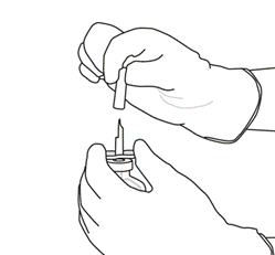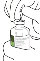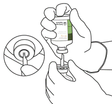 Tenez le flacon contenant l’eau pour préparations injectables en position verticale et sur une surface stable. Sur le dessus du flacon, percez le bouchon en caoutchouc avec la canule de transfert, de façon verticale et bien au centre du bouchon, en pressant doucement mais fermement, sans tourner. |