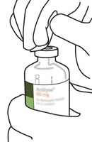 Retournez les deux flacons de manière à ce que l’eau pour préparations injectables puisse remplir complétement le flacon contenant la poudre. |