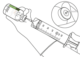 Prélevez la quantité nécessaire en utilisant une aiguille et une seringue. N’utilisez pas le même trou de perforation que celui de la canule de transfert pour éviter toute fuite. |