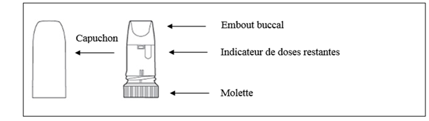 Le système Turbuhaler comporte (schéma 1) : une molette, un embout buccal, un indicateur de doses restantes.