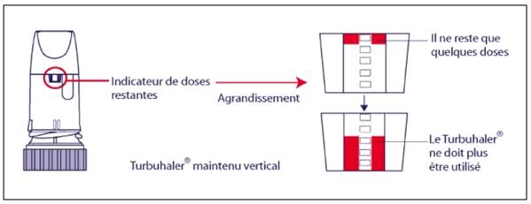 Lorsqu’une marque rouge apparaît en haut de la fenêtre de l’indicateur, il reste environ 20 doses dans le Turbuhaler. N'oubliez pas de contacter votre médecin suffisamment tôt pour prévoir le renouvellement de la prescription.