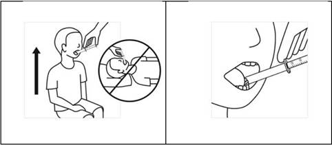 6) Maintenir l’enfant en position debout pendant l’administration. Introduire la seringue dans la bouche de l’enfant sans l’enfoncer, en la dirigeant sur la face interne de la joue. Administrer la totalité de la suspension en appuyant doucement et progressivement sur le piston.