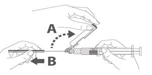 Étape 3 : A : soulever le boculier de sécurité en l’écartant de l’aiguille et en le poussant vers le corps de la seringue selon l’angle indiqué. B : Retirez le protège-aiguille en tirant tout droit. |