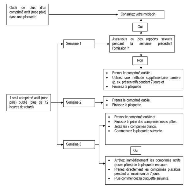 Chaque plaquette de 28 comprimés contient 21 comprimés rose pâle dans les rangées 1 à 3 et 7 comprimés blancs dans la rangée 4.