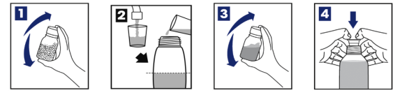 3. Fermez et agitez vigoureusement le flacon jusqu'à ce qu'il n'y ait plus de résidus de poudre au fond. Tenez le flacon à l’envers face à la lumière pour vérifier. Retournez à nouveau la bouteille. Si la suspension n’atteint pas la marque en relief sur le flacon (Une fois que la mousse s'estompe, remplissez lentement d'eau froide du robinet jusqu'à la ligne sur la bouteille, fermez le flacon et agitez à nouveau vigoureusement.