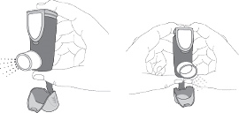 3. tenez le dispositif d’inhalation en position verticale ; appuyer sur l’indicateur de doses (sur le haut de l’inhalateur), pour libérer une bouffée dans l’air. Vous pouvez utiliser une ou deux mains, comme indiqué sur les dessins.