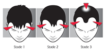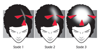 L’alopécie androgénétique débute par un dégarnissement des golfes temporaux. Puis une légère tonsure apparaît au sommet du crâne. Ces deux zones dépourvues de cheveux vont progressivement s ‘agrandir : l’alopécie androgénétique évolue progressivement vers la calvitie. |