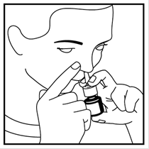 4. Placez la buse dans l’une de vos narines et fermez l’autre narine avec votre doigt - voir image 3. Pointez légèrement l’extrémité de la buse vers le côté extérieur, loin de la cloison nasale centrale. Ceci permet de pulvériser le médicament dans la bonne partie du nez.