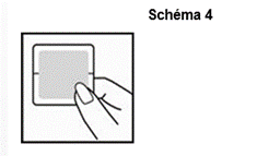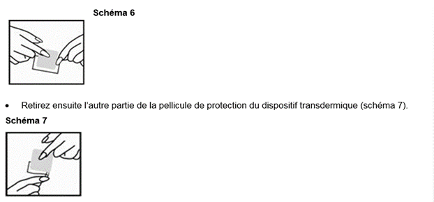 Le dispositif transdermique est recouvert d’un feuillet de protection transparent, qui est retiré avant utilisation, afin de pouvoir coller le dispositif transdermique sur peau.