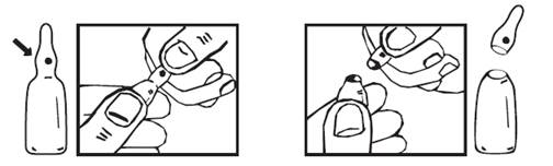 Important : l’ampoule est prélimée en un point d’étranglement. La tache colorée sur l’olive permet l’orientation de celle-ci. Saisir l’ampoule, le point coloré dirigé vers soi. L’ampoule s’ouvre facilement en plaçant le pouce sur le point coloré et en exerçant une légère flexion du haut vers le bas comme indiqué sur le dessin.