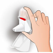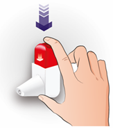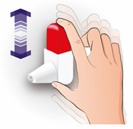 • Maintenez l'inhalateur à la verticale entre votre index et votre pouce • Pressez jusqu'à ce que vous entendiez un clic et relâcher l’inhalateur jusqu’à ce que vous entendiez de nouveau un clic. Cela libère une dose • Pressez une seule fois vers le bas