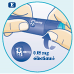 E Tournez le sélecteur de dose afin de sélectionner la dose minimale de 0,05 mg. |