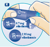 H Sélectionnez ou ajustez la dose dont vous avez besoin en tournant le sélecteur de dose dans un sens ou dans l’autre jusqu’à ce que le nombre correct de mg se trouve en face de l’indicateur. Lorsque le stylo contient moins de 4,0 mg, le sélecteur de dose se bloque au nombre de mg restant.