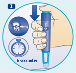 I Insérez l’aiguille dans votre peau comme vous l’a montré votre médecin ou votre infirmier/ère. Pour injecter, appuyez sur le bouton de dose jusqu’à ce que le chiffre 0 dans la fenêtre d’indication de la dose se trouve en face de l’indicateur. Pendant l’injection, vous pouvez entendre ou sentir un déclic. Gardez l’aiguille sous la peau pendant au moins 6 secondes pour vous assurer de recevoir la dose complète. Vous pouvez relâcher le bouton de dose pendant que vous attendez. |
