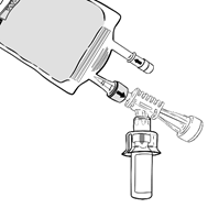 3. Identifier le plus gros embout de la poche (F1) et retirer sa protection. Retirer le capuchon de protection transparent de la grande pointe perforante du dispositif de transfert et le connecter à la poche. Le flacon est à présent connecté à la poche.