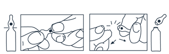 L’ampoule est prélimée en un point de l’étranglement. La tache colorée sur l’olive permet l‘orientation de celle-ci. Saisir l’ampoule, le point coloré dirigé vers soi. L’ampoule s’ouvre facilement en plaçant le pouce sur le point coloré et en exerçant une légère flexion du haut vers le bas comme indiqué sur le dessin.