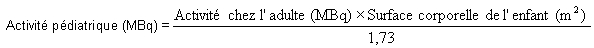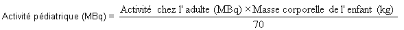 Chez l'enfant, l'activité à injecter est une fraction de celle utilisée chez l'adulte, calculée en fonction de la masse corporelle de l'enfant selon l'équation suivante: