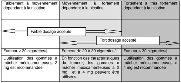 Les gommes à mâcher dosées à 4 mg sont recommandées aux fumeurs fortement ou très fortement dépendants de la nicotine et à ceux qui ont échoué lors d'une précédente tentative d'arrêt du tabac à l'aide d'un traitement par substitut nicotinique.