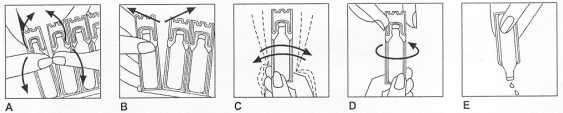 3. Agiter vigoureusement le récipient unidose et le retourner de haut en bas afin d'homogénéiser la suspension (figure C).