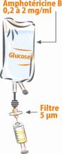 Exemple de préparation de la solution pour perfusion d’AMBISOME à la dose de 3 mg/kg dans une solution injectable de glucose.