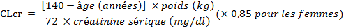 Pour utiliser ce tableau, il est nécessaire de calculer la clairance de la créatinine (Clcr) du patient en ml/min. La Clcr (ml/min) peut être estimée à partir de la valeur de la créatinine sérique (en mg/dl) selon la formule suivante :