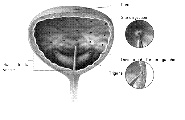 Chez les patients adultes atteints d’hyperactivité vésicale, ce traitement médicamenteux par injection dans le détrusor doit être inclus dans une prise en charge globale multidisciplinaire associant médecin urologue et gynécologue-obstétricien ayant reçu une formation spécifique d’utilisation de la toxine botulinique dans cette indication sous la supervision d’un urologue. Les injections de toxine botulinique doivent être réalisées sous visualisation cystoscopique, via un cystoscope flexible ou rigide, en évitant le trigone.