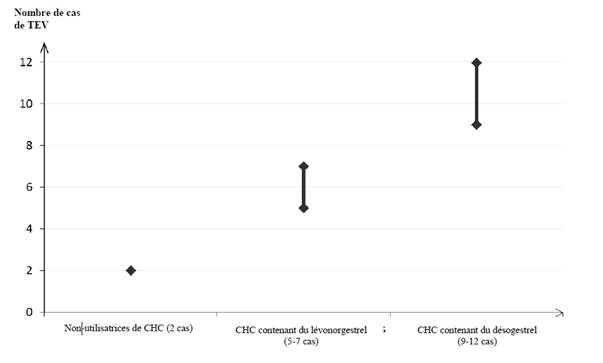 On estime[1] que sur 10 000 femmes qui utilisent un CHC contenant du désogestrel, 9 à 12 développeront une TEV sur une période d’un an ; ce nombre est à comparer à celui d’environ 6[2] chez les femmes qui utilisent un CHC contenant du lévonorgestrel.