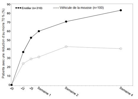 L’effet d’Enstilar sur les démangeaisons et la perte de sommeil due aux démangeaisons a été étudié dans l’Etude 1 en utilisant une échelle visuelle analogique (EVA) allant de 0 mm (pas de démangeaison/pas de perte de sommeil due aux démangeaisons) à 100 mm (les pires démangeaisons que vous puissiez imaginer/pire perte de sommeil imaginable). Un nombre de patients significativement plus important a atteint une réduction de leurs démangeaisons et de leur perte de sommeil due aux démangeaisons de 70% dans le groupe Enstilar comparé au groupe véhicule à partir de J3 et tout au long du traitement.