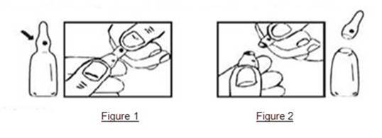 Important : l’ampoule est prélimée en un point de l’étranglement. La tache colorée sur l’olive permet l’orientation de celle-ci (figure 1). Saisir l’ampoule, le point coloré dirigé vers soi, l’ampoule s’ouvre facilement en plaçant le pouce sur le point coloré et en exerçant une légère flexion du haut vers le bas (figure 2). Ne pas ouvrir l’ampoule au niveau du trait.