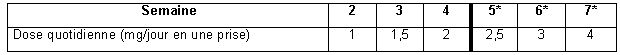 La dose peut être augmentée jusqu'à 1 mg une fois par jour à la deuxième semaine. La dose peut ensuite être augmentée de 0,5 mg par semaine sur les deux semaines suivantes, jusqu'à atteindre une dose de 2 mg une fois par jour. Chez certains patients, pour obtenir une amélioration optimale, la dose pourra être augmentée progressivement jusqu'à 4 mg au maximum, en une prise par jour. Au cours des essais cliniques, la dose a été augmentée de 0,5 mg par semaine jusqu'à atteindre la dose de 3 mg une fois par jour, puis de 1 mg jusqu'à atteindre la dose maximale recommandée de 4 mg une fois par jour, comme le montre le tableau 1.