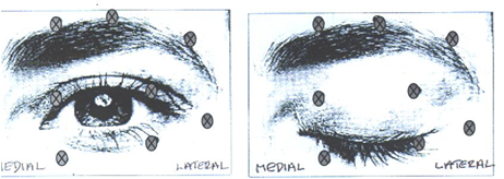 · 7,5 unités (0,30 ml) répartis entre trois sites (2,5 unités par site) : partie interne et externe du muscle orbiculaire de la paupière supérieure et partie externe prétarsienne du muscle orbiculaire de la paupière inférieure.