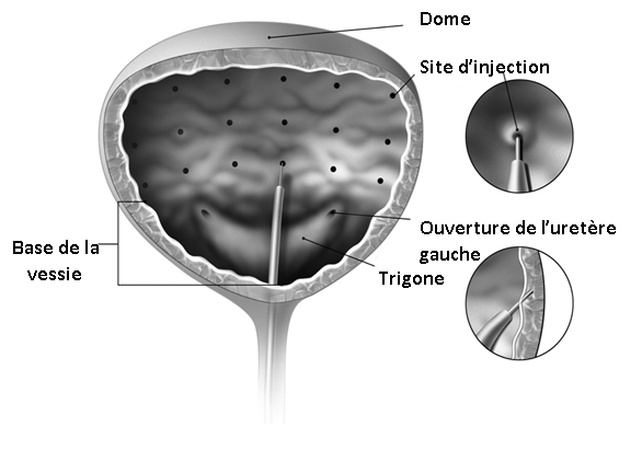 Chez les patients adultes atteints d’hyperactivité vésicale, ce traitement médicamenteux par injection dans le détrusor doit être inclus dans une prise en charge globale multidisciplinaire associant médecin urologue et gynécologue-obstétricien ayant reçu une formation spécifique d’utilisation de la toxine botulinique dans cette indication sous la supervision d’un urologue. Les injections de toxine botulinique doivent être réalisées sous visualisation cystoscopique, via un cystoscope flexible ou rigide, en évitant le trigone.