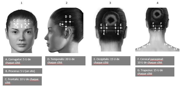 · 5 unités (0,20 ml) dans l'arcade sourcilière répartis en 2 sites (2,5 unités par site).