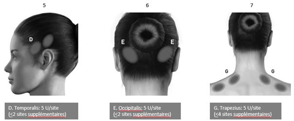 · sterno-cleido-mastoïdien : 40 à 75 Unités (0,40 à 0,75 ml), splénius : 75 Unités - 50 à 150 Unités (0,75 ml) et trapèze : 75 Unités - 50 à 100 Unités (0,75 ml). Pour chaque muscle, la dose sera répartie en 3 sites.