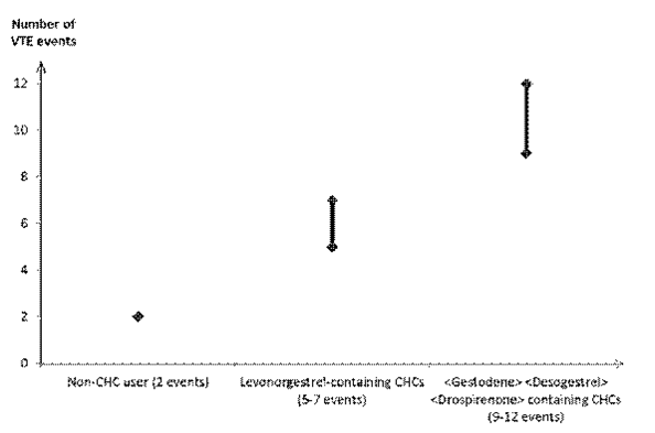 2 Point central de l’intervalle de 5-7 pour 10 000 années-femmes sur la base d’un risque relatif, pour les CHC contenant du lévonorgestrel par rapport à la non-utilisation d’un CHC, d’environ 2,3 à 3,6.