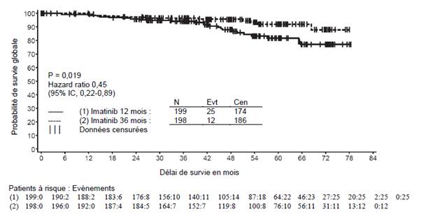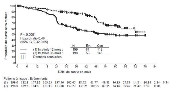 La durée de traitement : dans l’unique étude clinique menée à ce jour, le traitement par imatinib a été poursuivi jusqu’à la progression de la maladie (voir rubrique 5.1). A la date de l’analyse, la durée médiane de traitement était de 47 mois (24 jours à 60 mois).