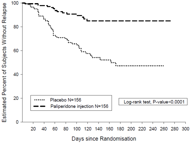 L’efficacité de la palipéridone dans le maintien du contrôle des symptômes et la prévention des rechutes de la schizophrénie a été établie dans une étude à long terme en double aveugle, contrôlée versus placebo, à doses flexibles impliquant 849 sujets adultes non âgés répondant aux critères DSM-IV de la schizophrénie. Cette étude incluait une phase de traitement de la phase aigüe et de stabilisation de 33 semaines en ouvert, une phase randomisée, en double aveugle et contrôlée versus placebo pour observer les rechutes et une période d’extension en ouvert de 52 semaines. Dans cette étude, la palipéridone a été administrée mensuellement à des doses de 25, 50, 75 et 100 mg ; la dose de 75 mg a été autorisée uniquement dans l’extension en ouvert de 52 semaines. Les sujets ont reçu initialement des doses flexibles (25–100 mg) de palipéridone pendant une période de transition de 9 semaines, suivie d’une période d’entretien de 24 semaines, au cours de laquelle les sujets devaient avoir un score PANSS ≤ 75. Des ajustements posologiques ont été autorisés uniquement pendant les 12 premières semaines de la période d’entretien. Au total, 410 patients stabilisés ont été randomisés sous palipéridone (durée médiane de 171 jours [allant de 1 à 407 jours]) ou sous placebo (durée médiane de 105 jours [allant de 8 à 441 jours]) jusqu’à ce qu’ils présentent une recrudescence des symptômes schizophréniques dans la phase en double aveugle de durée variable. L’essai a été arrêté très tôt pour des raisons d’efficacité car un délai avant rechute significativement plus long (p < 0,0001, figure 1) a été observé chez les patients traités par palipéridone comparativement au placebo (rapport de risque = 4,32 ; IC à 95 % : 2,4 à 7,7).