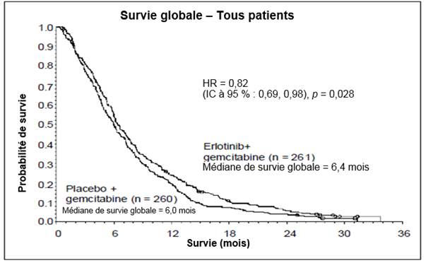 Dans une analyse post-hoc, les patients sous erlotinib ayant développé une éruption cutanée avaient une survie globale plus longue que les patients n’ayant pas développé d’éruption cutanée (médiane de survie globale 7,2 mois contre 5 mois, risque relatif HR : 0,61). 90 % des patients sous erlotinib ont développé une éruption cutanée dans les 44 premiers jours. Le temps médian d’apparition de l’éruption cutanée était de 10 jours.