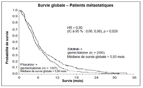 Dans une analyse post-hoc, les patients ayant un état clinique favorable à l’inclusion (faible intensité de douleur, bonne qualité de vie et bon indice de performance), peuvent tirer un meilleur bénéfice d’erlotinib. Le bénéfice est principalement lié à la présence de douleur de faible intensité.