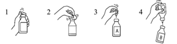 4. Retirer ensuite l’enveloppe protectrice de l’autre extrémité de l’aiguille de transfert, retourner le flacon dans lequel est insérée l’aiguille de transfert et insérer immédiatement l’autre extrémité de l’aiguille toujours libre dans le flacon contenant le produit (B).