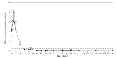 Les taux de testostérone étaient surveillés à plusieurs intervalles pendant 168 jours. Comme attendu, après la première injection les taux moyens de testostérone ont rapidement augmenté par rapport aux taux de départ (4,119 ±1,341 ng/mL), et ont atteint des pics (Cmax) de 6,598 ±2,249 ng/mL dès le troisième jour. Après cette augmentation, les taux de testostérone ont chuté, et le 21e jour, 78,7 % des patients évaluables ont atteint la castration médicale (définie par un taux de testostérone inférieur à 0,5 ng/mL). Le 28e jour, 96,8 % des patients ont atteint des taux correspondant à la castration et 73,1 % ont atteint des taux ≤ 0,2 ng/mL (Figure 1).
